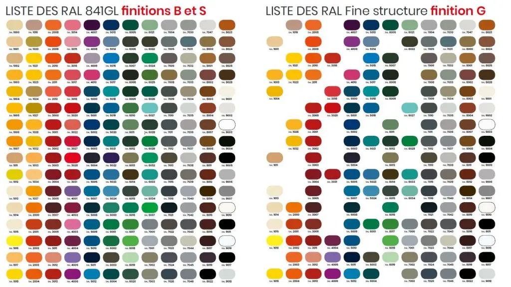 - 192 teintes RAL en finition brillante et satinée/mate et 155 texturées
