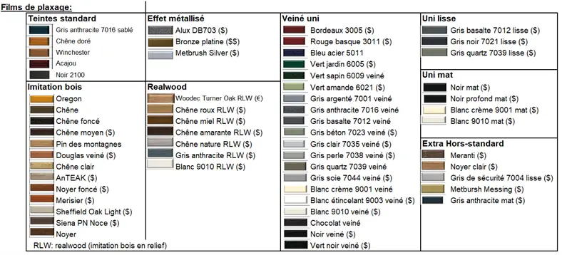 Soit en finition « plaxée« : un film décoré de grande robustesse est apposé lors de la fabrication du profilé sur une ou deux faces avec un grand choix d’aspects: imitation bois ou aluminium, couleurs naturelles, …