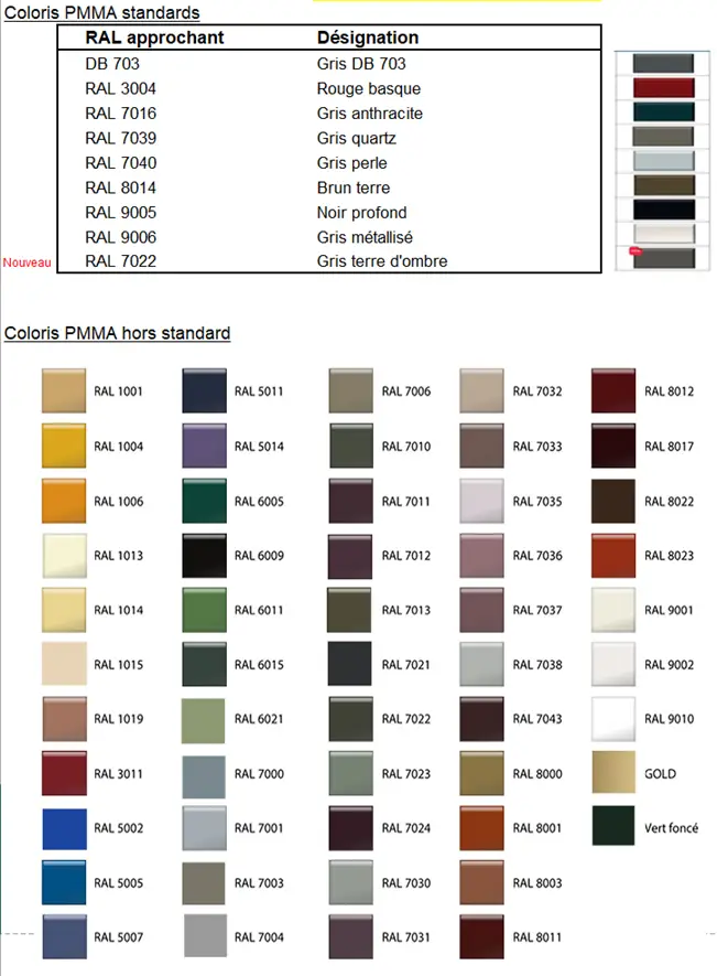 Ou en finition « PMMA« : un revêtement rigide, connu aussi sous le nom de Plexiglass, est fusionné avec le profilé pour une durabilité et une résistanceexceptionnelle.