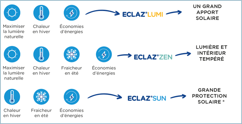 Plutôt que d’utiliser un vitrage standard pour toutes vos fenêtres, vous ferez des gains de confort et des économies de chauffage ou de climatisation en adaptant vos vitrages à l’orientation de vos façades : la gamme Eclaz est faite pour ça!